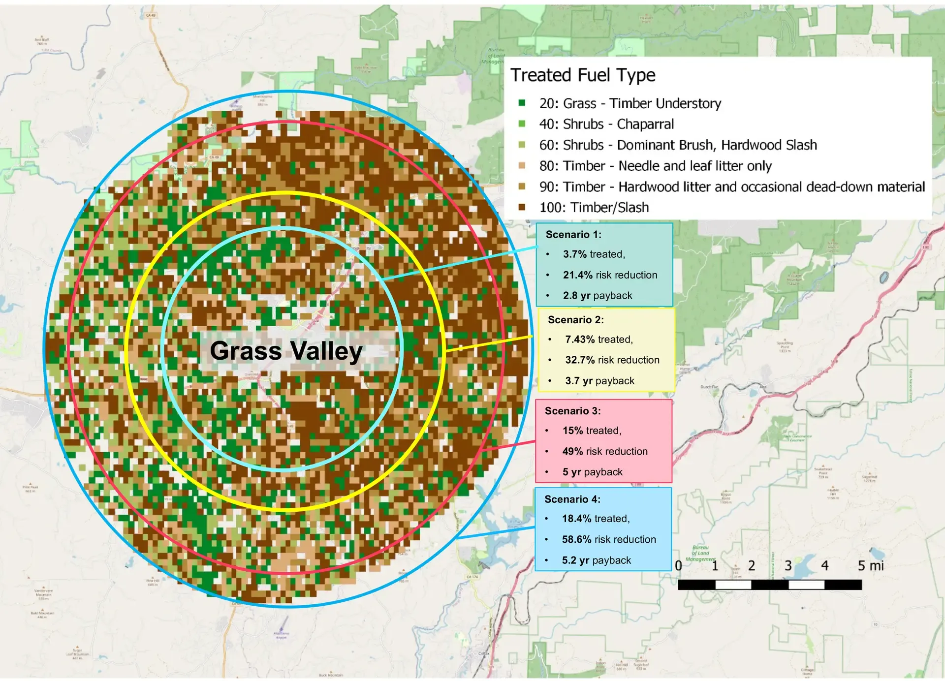 Results indicate that under certain biophysical, logistical, and economic considerations, forest fuels mitigation treatments could result in 21-59% avoided average annual loss to infrastructure with scales of treatment between 3.7% (14,871 acres) and 18.4% (74,088 acres) of total landscape area. Under conservative treatment and maintenance assumptions, the estimated net present value of fuel modification can range from $13 to $17 million dollars over a 15-year period.